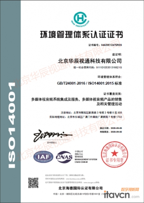 【数字视听网讯】近日,北京海德国际认证有限公司为北京华辰视通科技有限公司 ( 简称:华辰视通 )颁发了ISO14001:2015环境管理体系证书。这标志着华辰视通正式完成环境管理体系认证工作,为后续市场推广,提供了更有力保障。