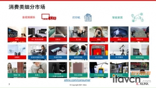 另外,还有家居健康相关的网关设备、户外运动设备、智能家电设备,甚至汽车后装市场设备也都是赛灵思所支持的应用领域。所以大家可以看到赛灵思所覆盖的消费类市场领域用也是一个非常广泛的应用海洋,他们里面的分门别类是没可能被一两个专门的电视主芯片也好,或者是手机主芯片来去覆盖的,也只有像赛灵思这样的通用、灵活应变的的平台,才能全面满足这一块市场的广泛应用。