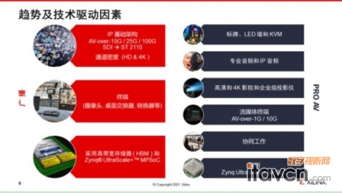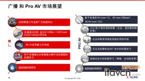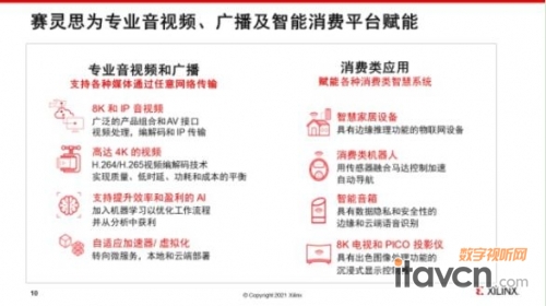 广播电视和专业音视频应用业务占赛灵思2021年财年大概10%左右的份额,赛灵思对于基础设施的设备应用非常广泛。赛灵思专业音视频和广播细分市场,主要针对以下几种应用,一个是影院级别的应用,另外是大型现场活动设备方面的应用,另外还有专业音频,尤其是专业音频的处理和数字混音器的应用及数字标牌更专业音视频领域等。