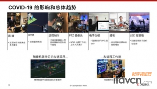 远程制作利用PTZ摄像头远程能够控制摄像头的跟踪和缩放。电子白板除了直接的视频内容的远程直播之外,还有现场的交流。电子白板通过远程的采播对延时和图象质量提出了非常高的要求。播客这样的应用大大促进了了麦克风和流媒体设备的增加。最后LED背景墙的用途就是在疫情期间用来代替背景的内容,就是说当旅行不再变成触手可及的时候,以前需要旅行来解决的背景内容现在往往通过大型的高清、高质量的LED背景墙来实现。 最后在整个疫情期间,大家可以看到更多的机器学习在助力内容制作,尤其是体育节目的制作。不管是内容的分析,还是对目标的跟踪,各个方面都体现了内容制作技术的更新迭代。