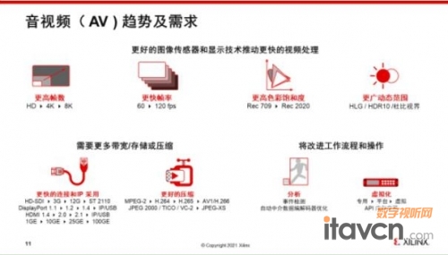 无论从HDSDI到12G和ST2110的演进,和DP1.1到DP1.4,DP2.0,和IP USB的演进和HDMI1.4到USB的演进,和1G到100G以太网.像素的变化推动了标准的演进和技术的升级。对于压缩来讲,从早期的DVD级别MPEG-2,一直到现在针对8K实现的AV1和H.266 等,除此之外还有各种各样跟内容制作息息相关的JPEG 2000/TICO相关的所谓的视觉无损压缩的要求和共存都提出了非常严苛的要求。
