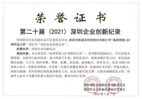 此外, 联诚发龙此款高清智能LED球型显示屏产品曾凭借卓越的产品品质与技术创新性,于2021年3月成功入选《深圳市创新产品推广应用目录》,得到了深圳市相关部门的高度肯定与认可。