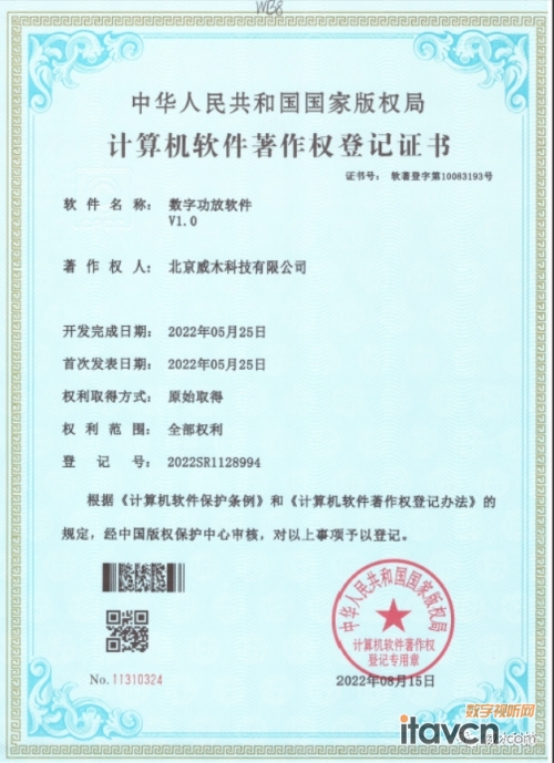 【数字视听网讯】北京威木科技有限公司自创立以来,十分注重技术研发和创新,数字功放产品已获得国家版权局颁发的软件著作权证书和专利证书。