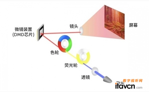 DLP是由美国Texas Instruments研发的技术。DLP芯片是一个由数以万计的微镜片所组成的反射表面。每个微镜片代表一个单独的像素。在一台DLP投影机中,来自光源的光线被定向到DLP芯片的表面,镜片来回改变斜率,要么将光线反射到镜头路径上来开启该像素,要么使光线离开镜头路径来关闭该像素。