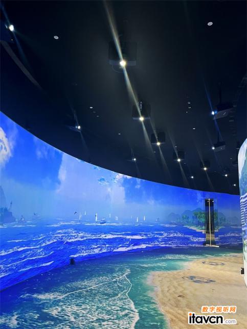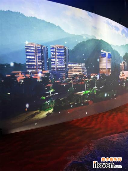 影片内容以介绍小梅沙国际都市和山海自然风光为主,外弧墙面通过投影机营造出了一幅人们嬉戏海洋的画面,生动的人物、海鸥和帆船在精美的投影下显得栩栩如生,曲线的建筑造型拉大了天际和海面的视觉空间,配合着地面的海浪和沙滩的投影,一个超具沉浸感与现实感的海边场景呈现在人们面前;内弧墙面上一幢幢充满未来感与科技感的建筑群在连绵不断的山间耸立,山海相望,海滩相连,一幅充满自然、活力与时尚的小梅沙地区的画像通过投影生动地跃入眼帘。