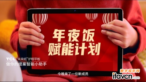 片中,小女孩通过TCL“未来纸”护眼平板,查看各地食谱,让年夜饭菜式更丰富。