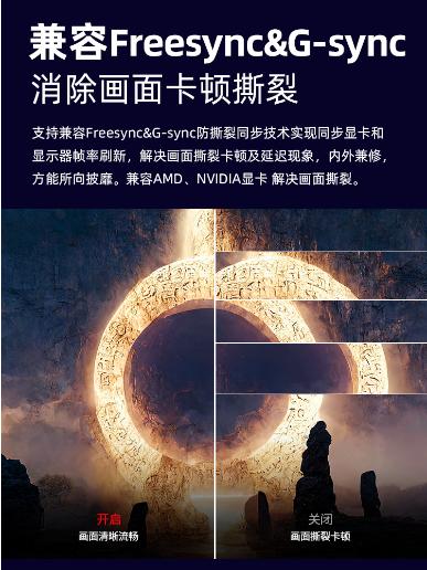 优派VX24G10兼容Freesync & G-sync防撕裂同步技术,实现同步兼容AMD和NVIDIA显卡与显示器帧率刷新,解决画面撕裂卡顿及延迟现象,内外兼修帮助玩家所向披靡。