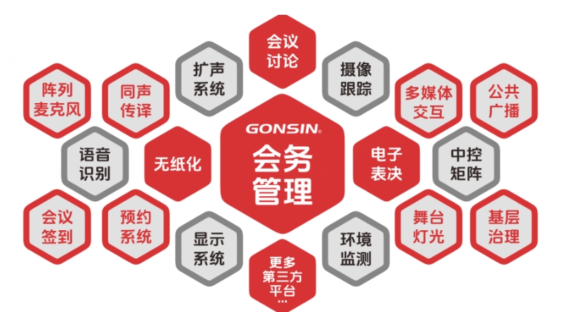 GONSIN公信智会联-会务管理平台整体解决方案涵盖会务管理系统、无纸化会议系统、10000N有线无线融合会议系统和语音识别系统,致力于为政务及商务会议提供行业领先的创新解决方案。融合云计算、大数据、物联网和SaaS等先进技术,支持功能定制、界面定制、模块化监控运维以及对接第三方平台及设备,全面满足多样化会议需求,提升用户会议效率和体验。