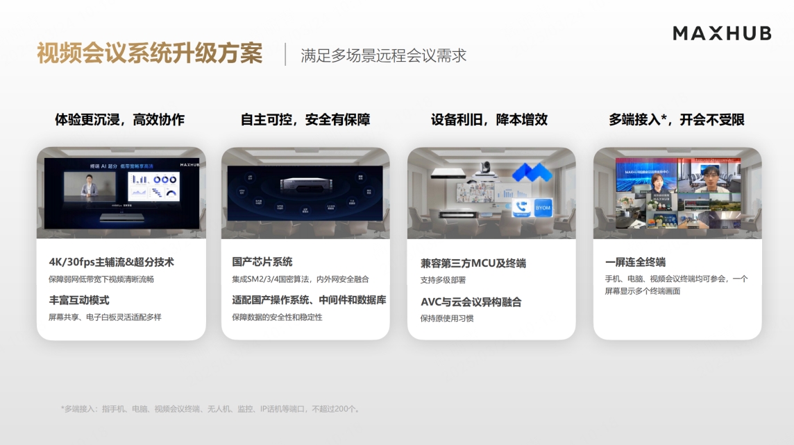 此次荣获政府采购领域的权威奖项,源于MAXHUB对政企用户需求的持续深耕。针对应急调度、视频会商、协同办公、学术研讨等典型场景,MAXHUB 打造的智能会议空间解决方案、智能公共空间解决方案、视频会议系统升级方案,能够满足政企用户视频高清化、办公移动化、数据安全保障、资源整合应用等高效会议办公的需求,成为提升行政效率的“数字化抓手”。