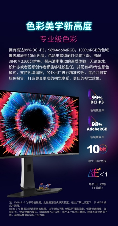 专业级色彩表现让优派XG273-4K-OLED美出另一种境界,拥有的99% DCI-P3,98% AdobeRGB、100% sRGB广色域覆盖和原生10bit色深,让色彩丰富绚丽且过度平滑;搭配3840 x 2160超高清分辨率,带来清晰生动的画质;配备的多种专业颜色模式打造更真更准的视觉效果。