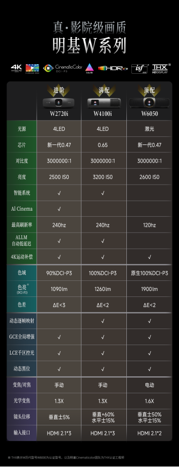 值得关注的是,明基此次的技术升级,并非孤立的产品迭代,而是覆盖了不同层级的市场需求。从入门级的W2720i到专业级的W4100i,再到旗舰级的W6050,这种阶梯式产品布局既满足了普通用户搭建客厅影院的基础需求,也为影音发烧友提供了客制化的私人影院解决方案。无论是从色彩还原度、动态解析力,还是定制影院设计等方面而言,明基定制影院系列都真正做到了将商业影院搬回家。