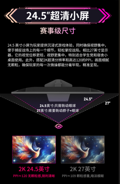 除了速度,画质同样是电竞体验的重要组成部分。该显示器配备2560×1440(2K)分辨率,在24.5英寸屏幕上实现更高像素密度,带来更清晰、细腻的画面表现。无论是游戏中的复杂光影,还是地图细节与敌人轮廓,都能精准呈现,助力玩家更快做出判断。