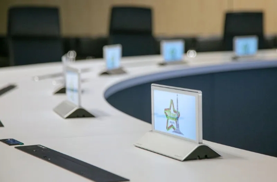 其中,在VIP会议室中部署了超过170个无纸化多媒体会议系统、电子铭牌系统。其中无纸化多媒体会议系统集成了可伸缩显示屏、话筒、文件共享、电子签到、投票及多语种译员功能;电子铭牌系统则是对与会人员信息进行数字化、规范化显示,特别适用于高规格、多语种会议场景。